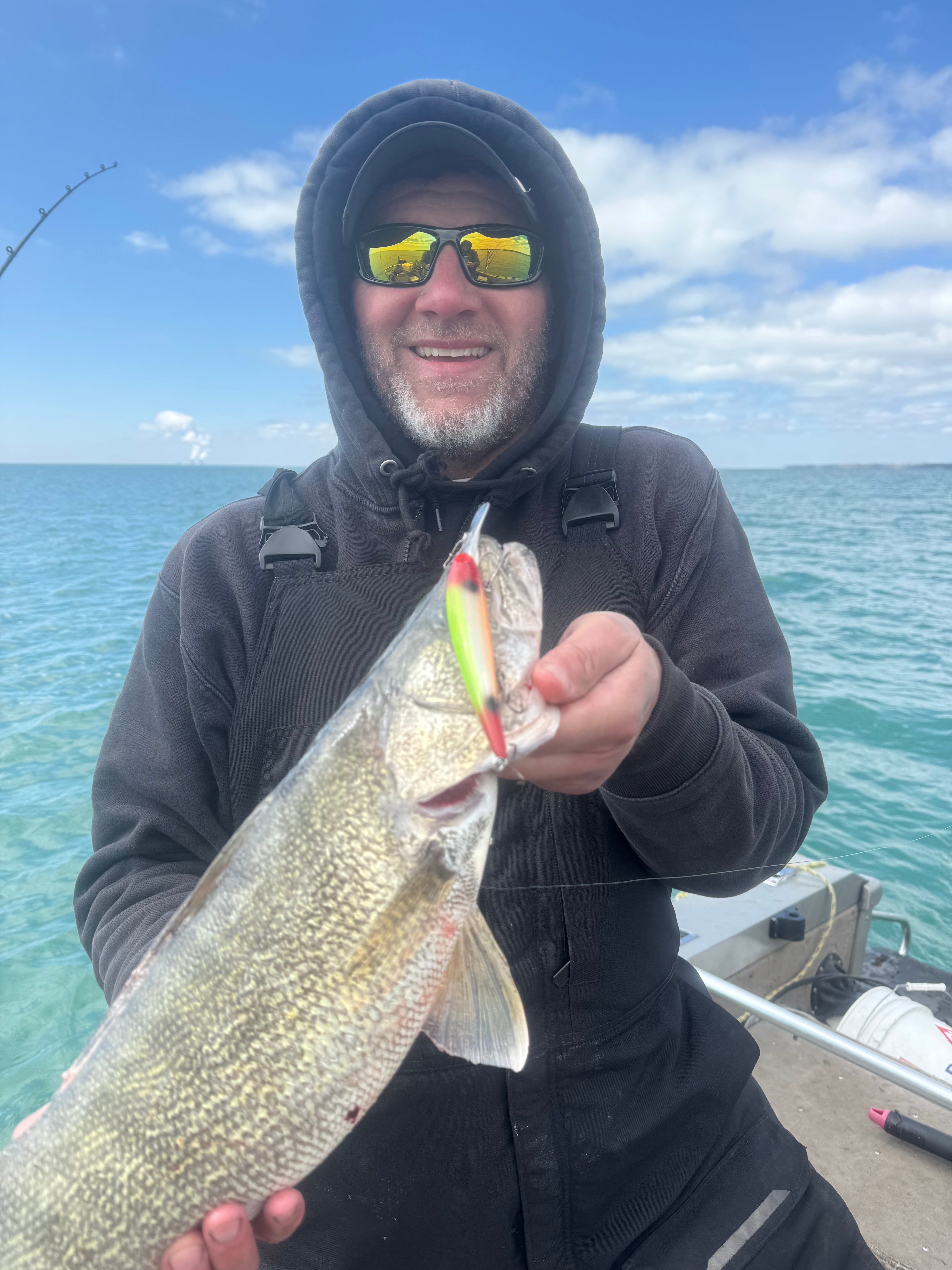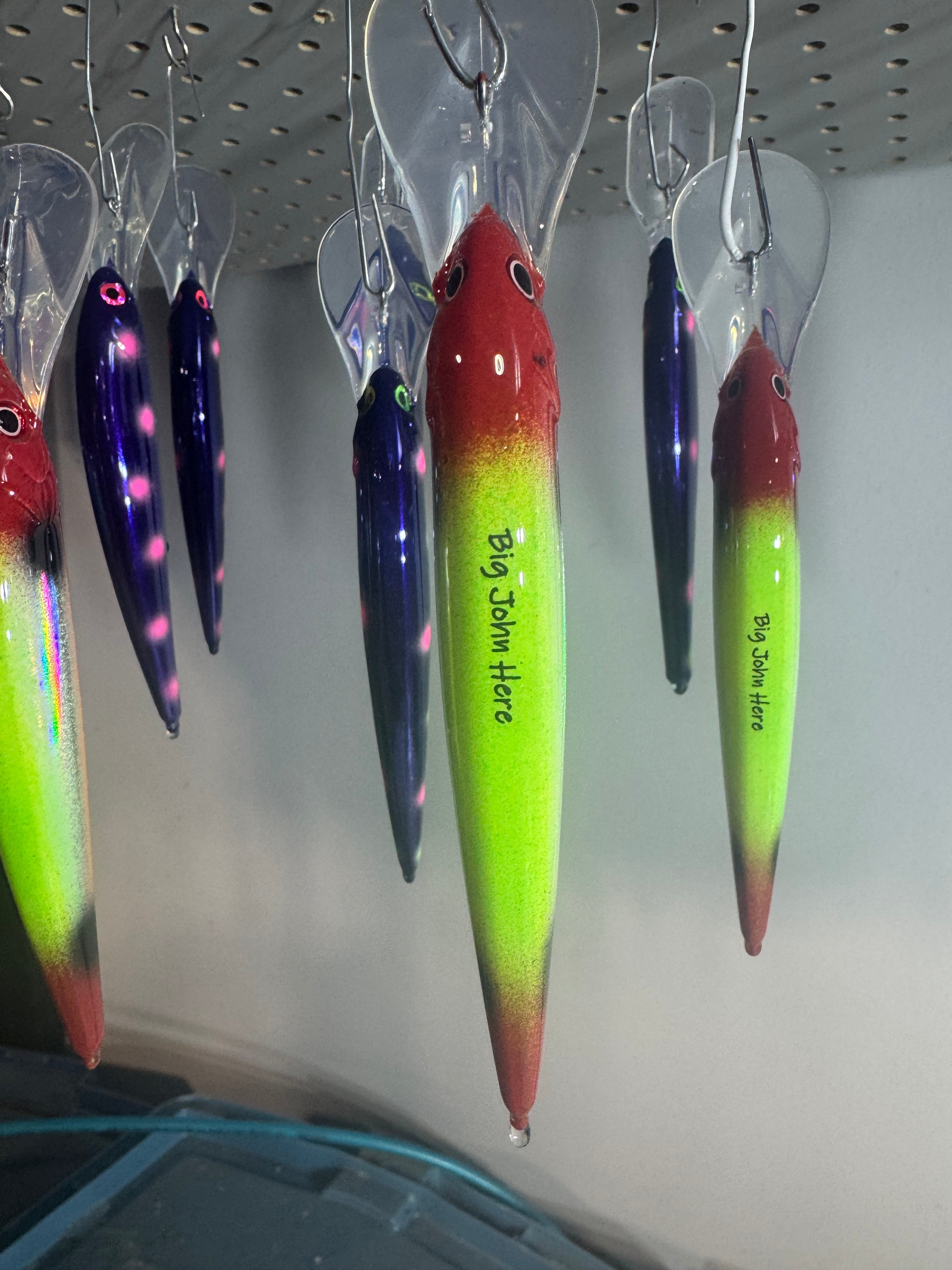 This bait was co-designed by Big John himself. After a couple iterations, we settled on the bait below. It has a red head and tail, with a greenish-chartreuse on the back and an orange belly. It also has 2 black spots on each side. It has been a consistent producer in the short time that it has been around!