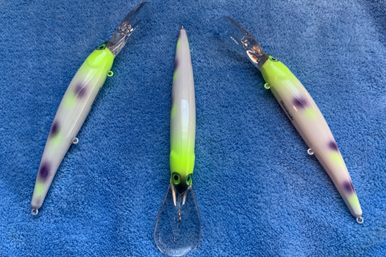Recently updated due to several customers requesting that I use darker purple for the spots. This bait has a chartreuse yellow head, with a hint of purple around the eyes. Purple and chartreuse dots over a pearl white body. This has become the favorite pattern for one of my usual fishing partners. It is the first one that he puts out every time. The picture with the fish is the older version. I really like the contrast of the bright yellow with the purple spots and pearl white body. It's almost too pretty to fish with.