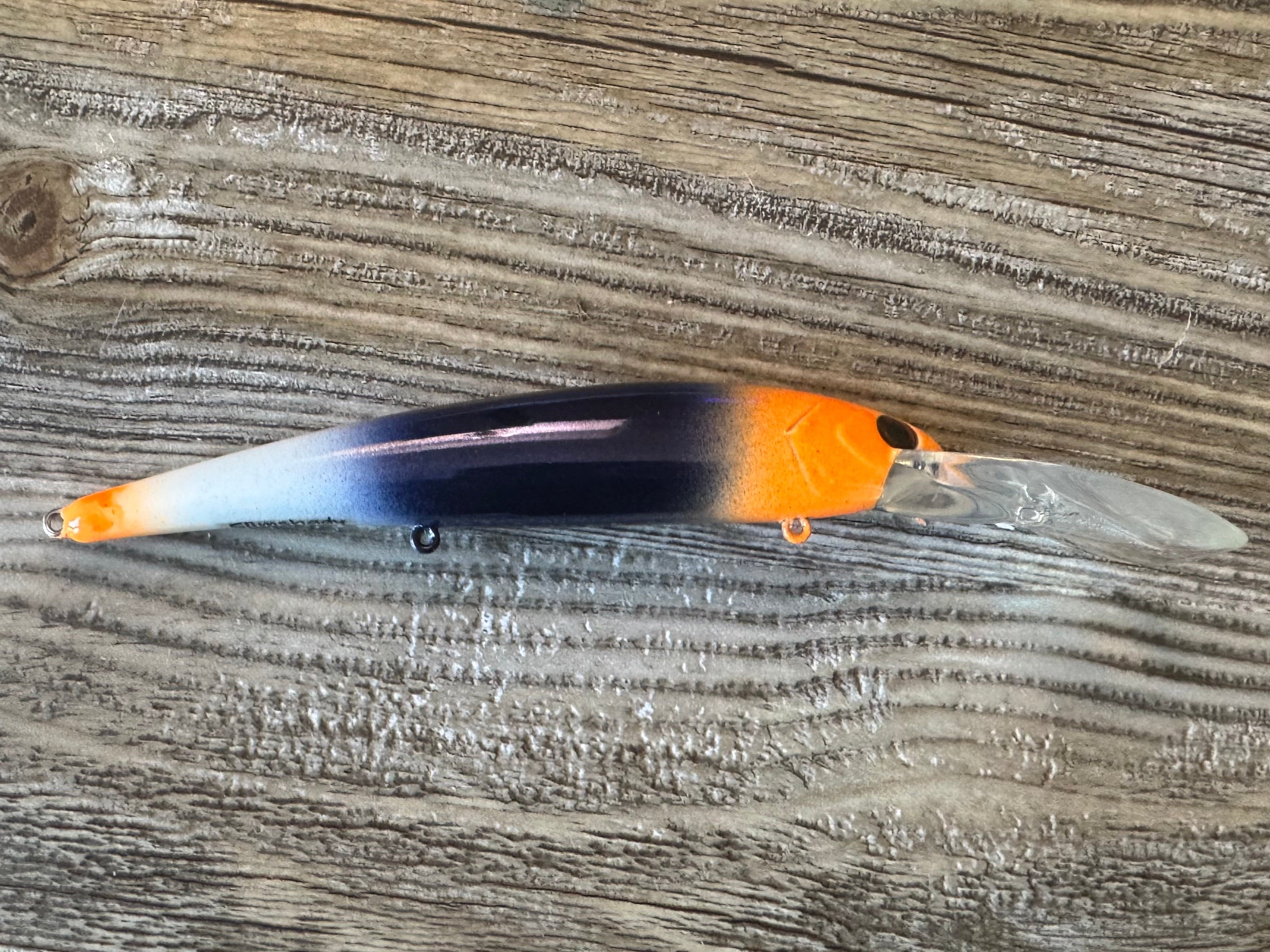This brand-new bait starts with a chrome blank, with translucent midnight blue in the middle with a hot orange head and tail, with a white section in between. This is a variation of other productive patterns I have made like Chrome Kermit & Beckaliscious. I expect this pattern to be great in stained water, especially on bright sunny days. I can't wait for the ice to leave so I can try it!!