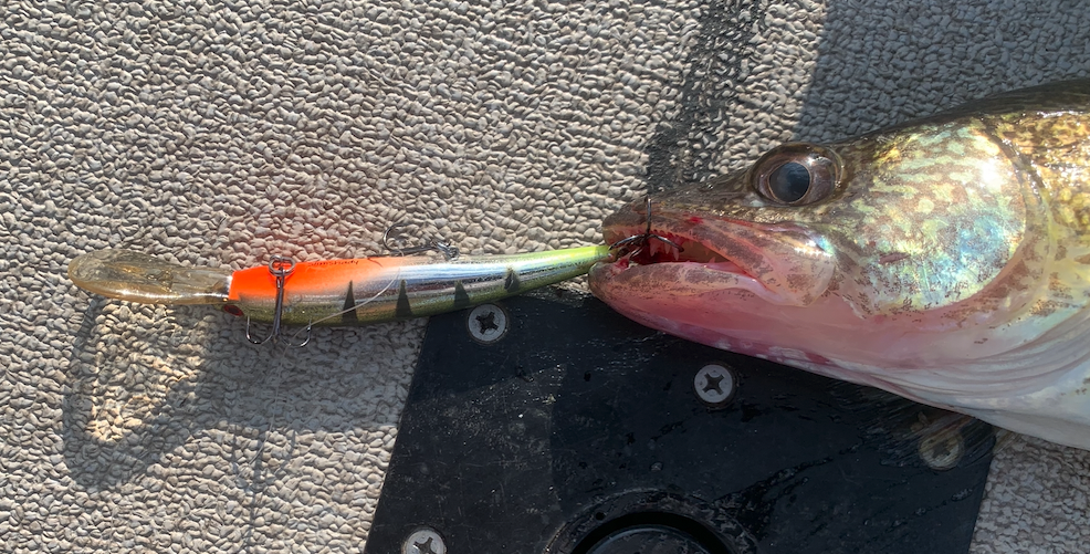 Classic perch pattern on a chrome blank. A touch of hot-orange on the belly. This bait has been on fire for walleyes and smallies out on Lake St. Clair this summer. It is the first bait out of my box now when it is sunny. I have also lost a couple to big muskies, so I decided to use heavier leaders in the future.