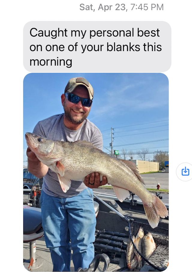 "Hi Mike, I just had to send you an email… I painted up your blanks and our group probably caught 3/4 of all our fish on your blanks that I painted… AND I caught my first 30” 10lb walleye… on my own painted bait…. Absolutely pumped up…I will be buying more… thanks again!!" - Tim Harding, WI