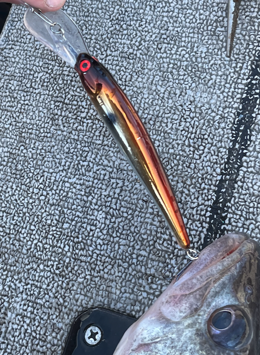 Chrome blank with translucent copper on the back, with black accents. White belly with hot orange under the chin and tail. This bait was my hottest pattern in the late spring, especially on bright sunny days with lightly stained water. Initially, I only had the original prototype with me, so of course it was the best pattern we had. You can probably see from all the teeth marks that they really liked it.