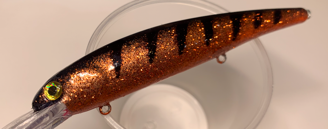 This is one of my most popular patterns, and it looks amazing in-person, especially in the sun. It has copper sides with an intense shine from the fine copper glitter, with a hot orange belly and black accents at the top. It was designed after one of our most productive spoon patterns. A buddy of mine bought 2 in his first order, then ordered 6 more because he said it was the best bait he had.