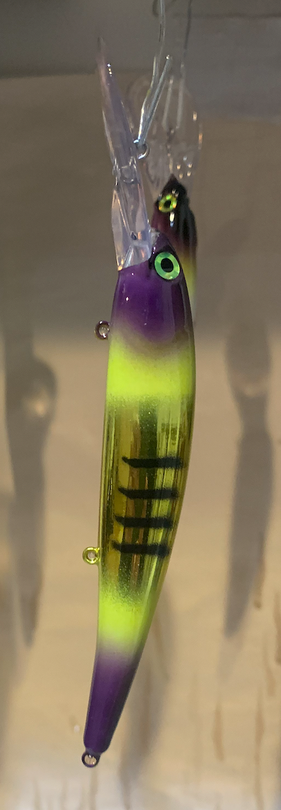 This bait has deep purple on the head and tail, with black accents over the top. In the middle it is gold with a custom painted graphic. In between, it has chartreuse giving it lots of contrast, which is awesome in mild to heavily stained water.