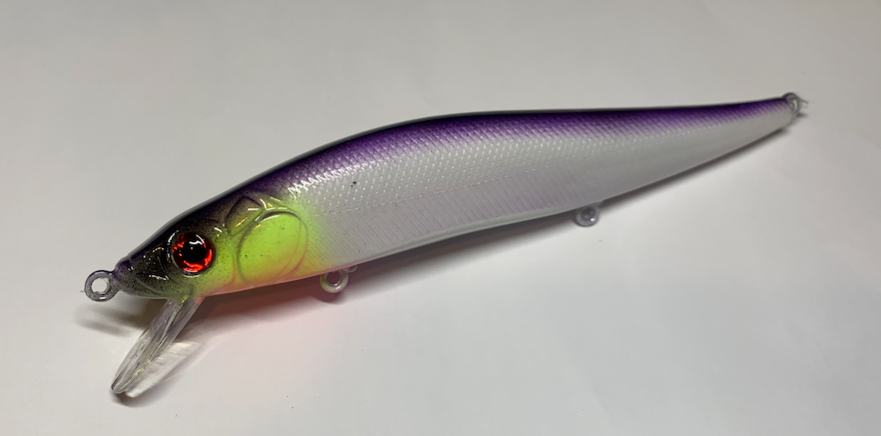 This bait has an iridescent purple back over a pearl white body, with chartreuse on the cheeks and a hint of hot-pink under the chin. The more recent versions have a small shad dot on the side as well. It was inspired by my cousin, Jeremy Bartman (aka J-Bart), who is an avid walleye fisherman from South Dakota. He said that this pattern catches fish when nothing else gets touched. Plus, it is similar to Purpledescent, which has always been a great color for walleyes on Erie. I liked the look, so I added it to my catalog. I ended up making this pattern in shallow divers and shad baits too. They all catch fish.