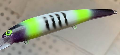 This bait has iridescent purple on the head and tail, with black accents over the top. In the middle it has pearl white with a custom painted graphic. In between, it has florescent yellow giving it lots of contrast, which has been awesome in light to heavily stained water.