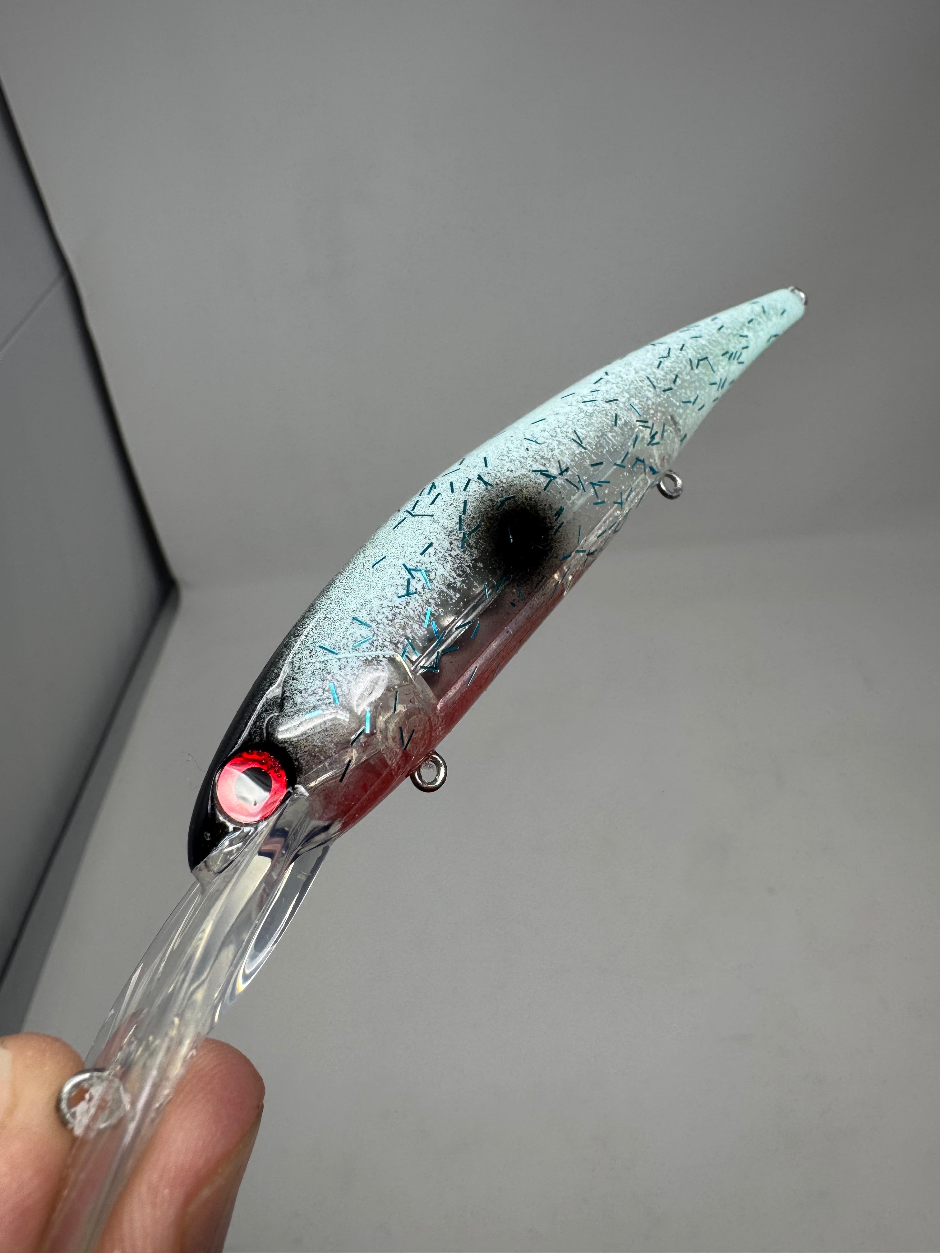 Mint green over a clear blank with black on the head, red under the chin and the classic shad spot. To further enhance the "glacier" look, I added blue and pearl glitter to it. This bait looks stunning in person and it works great! You may recognize the name of this pattern from Captain Juls' Blog (OH). She has been doing very well with it. It is extremely natural looking, so it does well in clear water and lightly stained water.