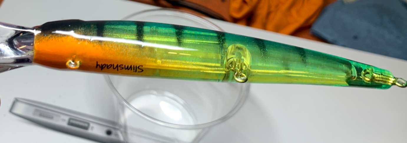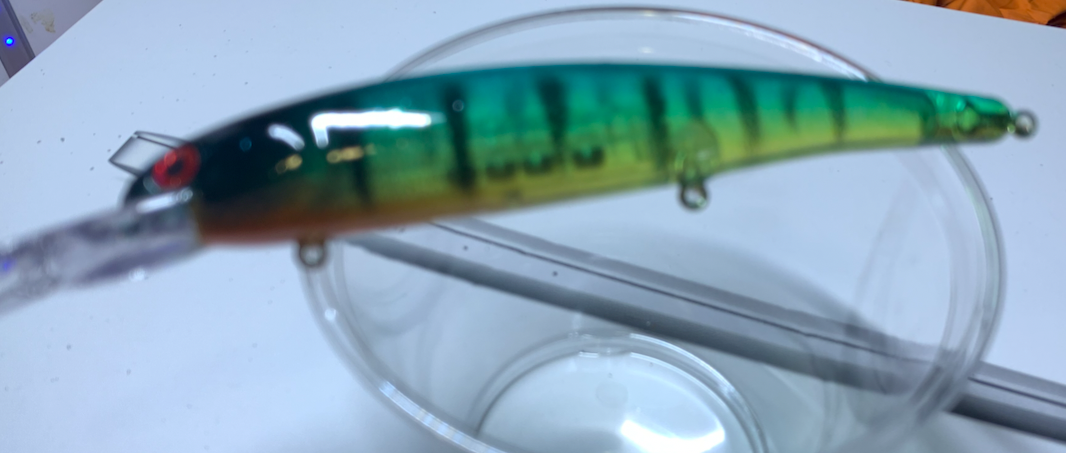 This is bait has translucent green on top with translucent yellow on the bottom over a clear blank. It has a black head and perch stripes, with hot orange under the chin.