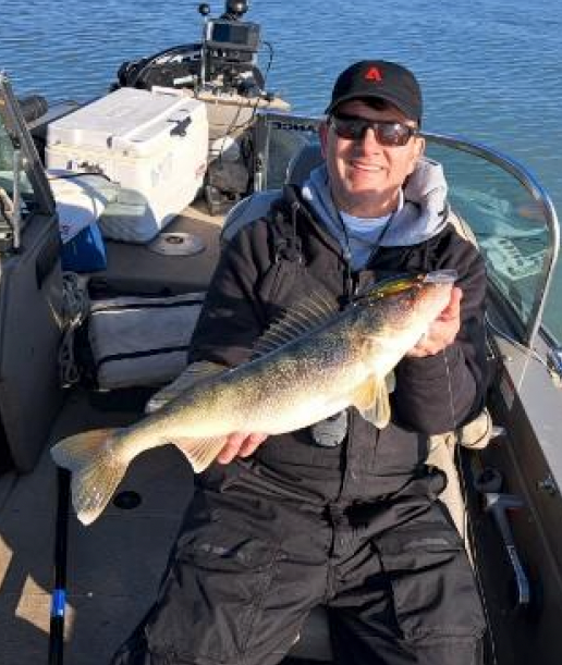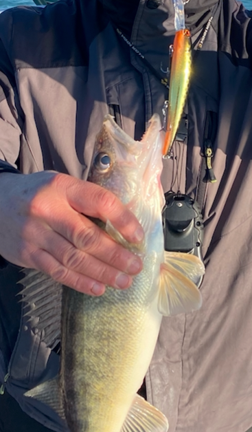 This bait has translucent gold over a chrome blank, with a black back and black accents on the head and tail, with bright orange under the chin and tail. This past weekend on Lake St. Clair (Nov. 2022), it caught 6 of our first 7 fish, and 10 out of 20. It was hot the next day as well.