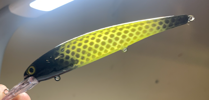This bait has a semi-translucent chartreuse yellow scale pattern, with black on the head and tail. This is a variation of the Grave Digger pattern that has been so effective this fall, only with Chartreuse vs hot green. This pattern was on-fire on a recent trip to Erie in fairly stained water. It caught 4 of our fist 6 fish.