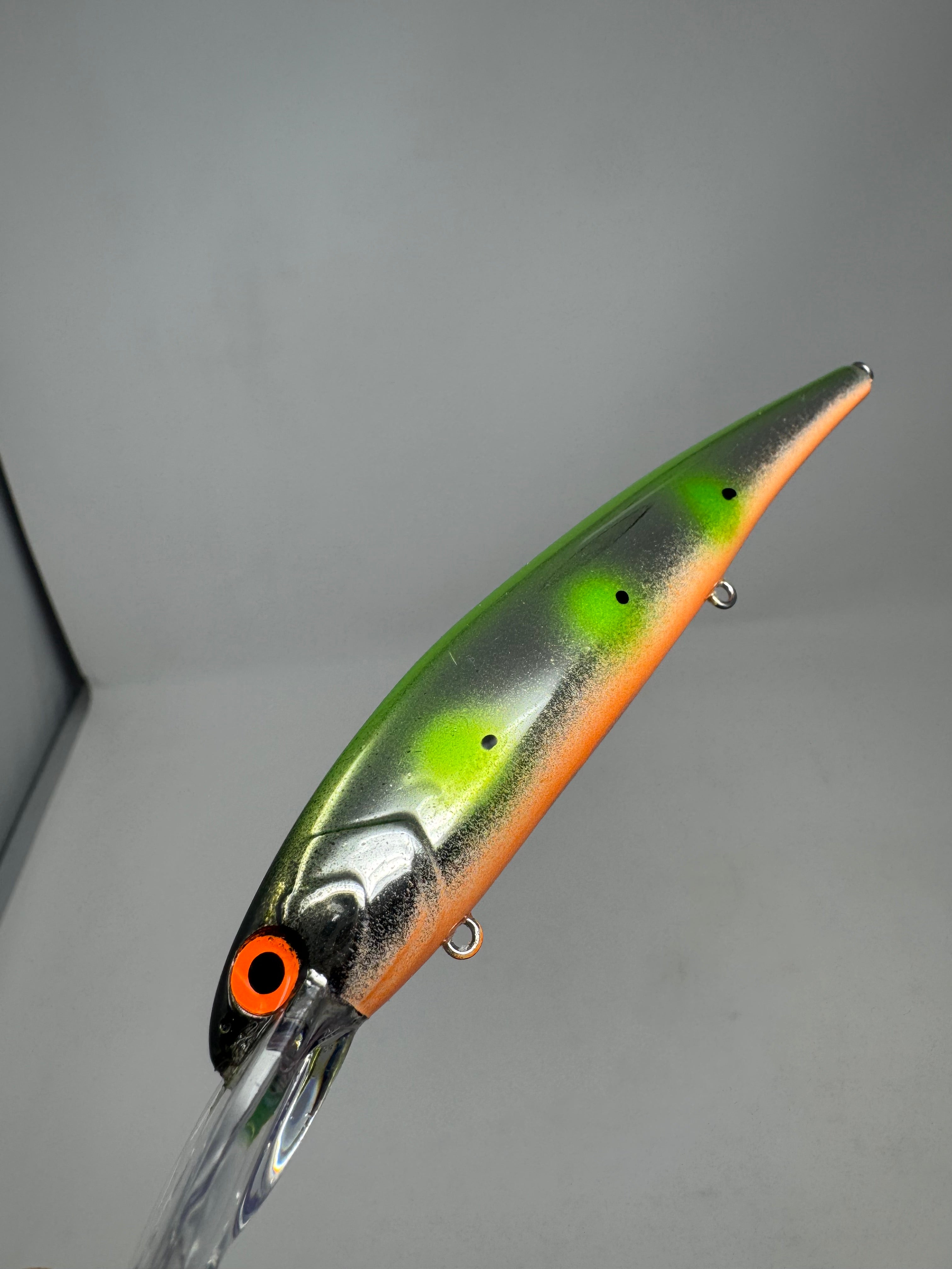This bait has translucent florescent green over a chrome blank, with florescent green dots with black in the center of them. It has a florescent orange belly and black accents on the head. It’s a great bait for sunny days and clear to medium stained water.