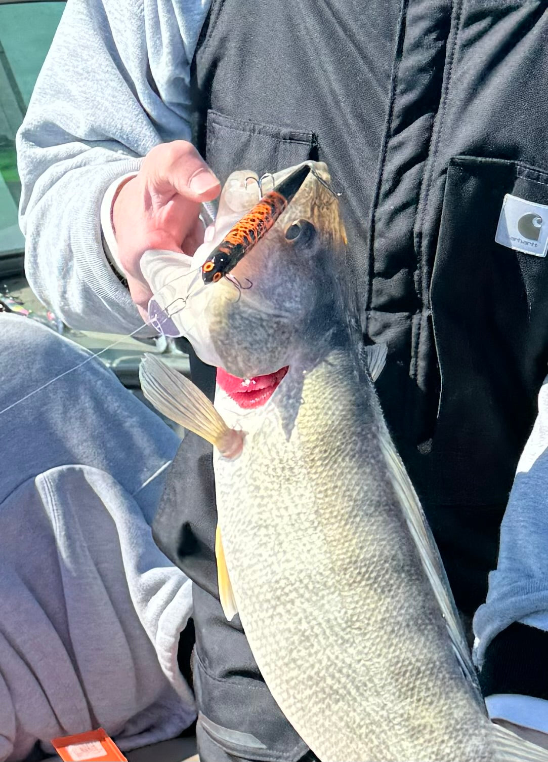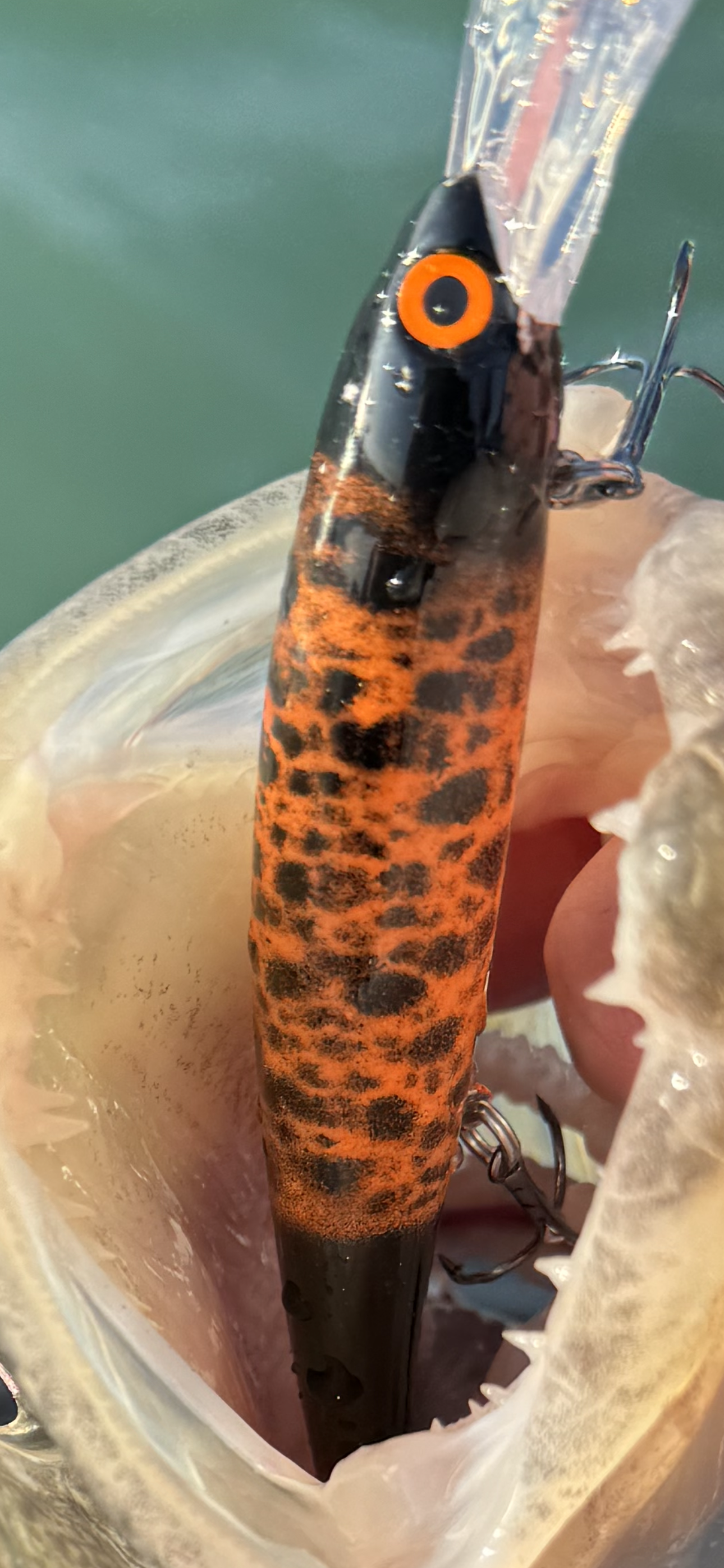 This bait has florescent orange with black in a custom pattern on the sides. It had a solid black head and tail. This bait was awesome in stained water this spring Erie.