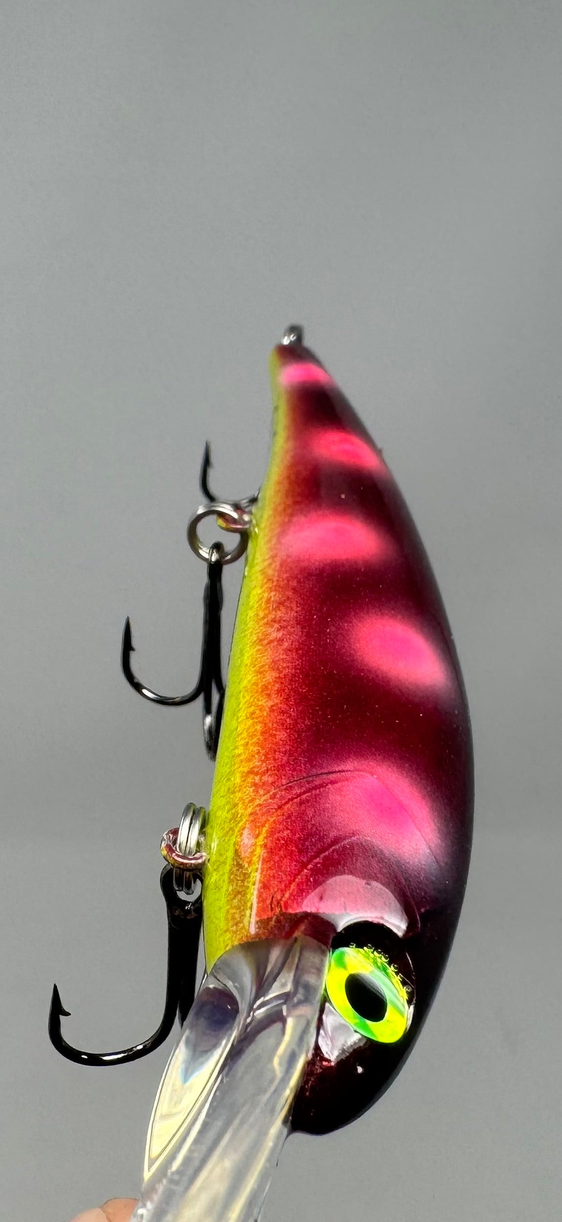 This bait has translucent red, blue and purple over a holographic blank. On the sides, it has hot pink dots and a chartreuse belly.