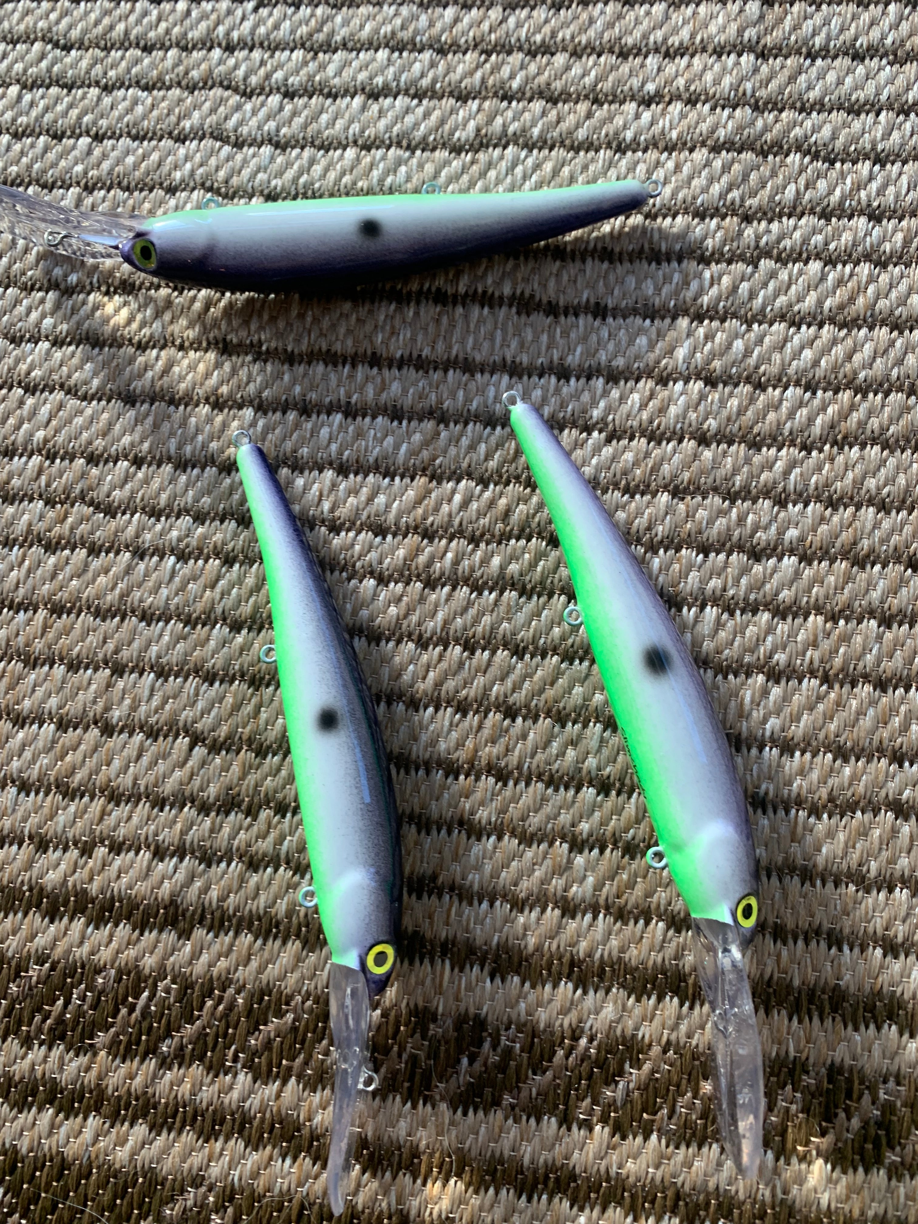 This bait has a purple back and white sides, with hot green on the belly and black accents on the head with a classic shad spot.