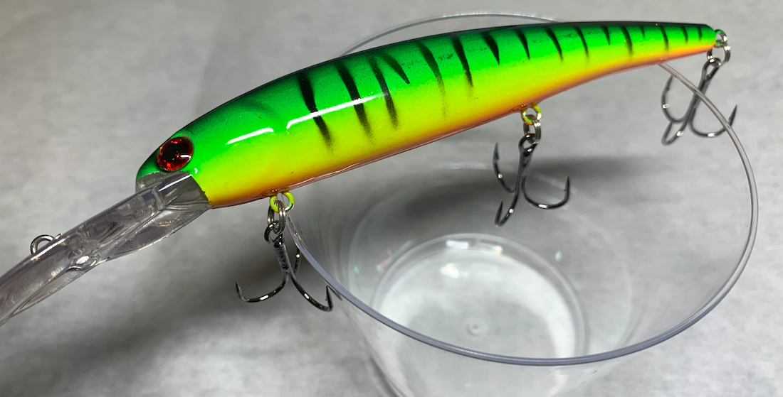 This is the classic fire-tiger pattern, with green & chartreuse sides, hot orange belly, with black accents on the back & sides. Fire tiger has always been a strong pattern in stained water and cloudy skies.