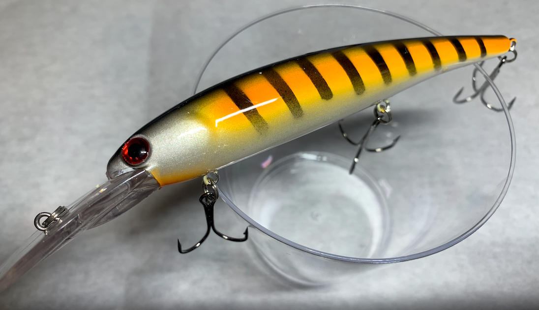 This bait has a pearl white base, with orange on the sides, and black stripes.