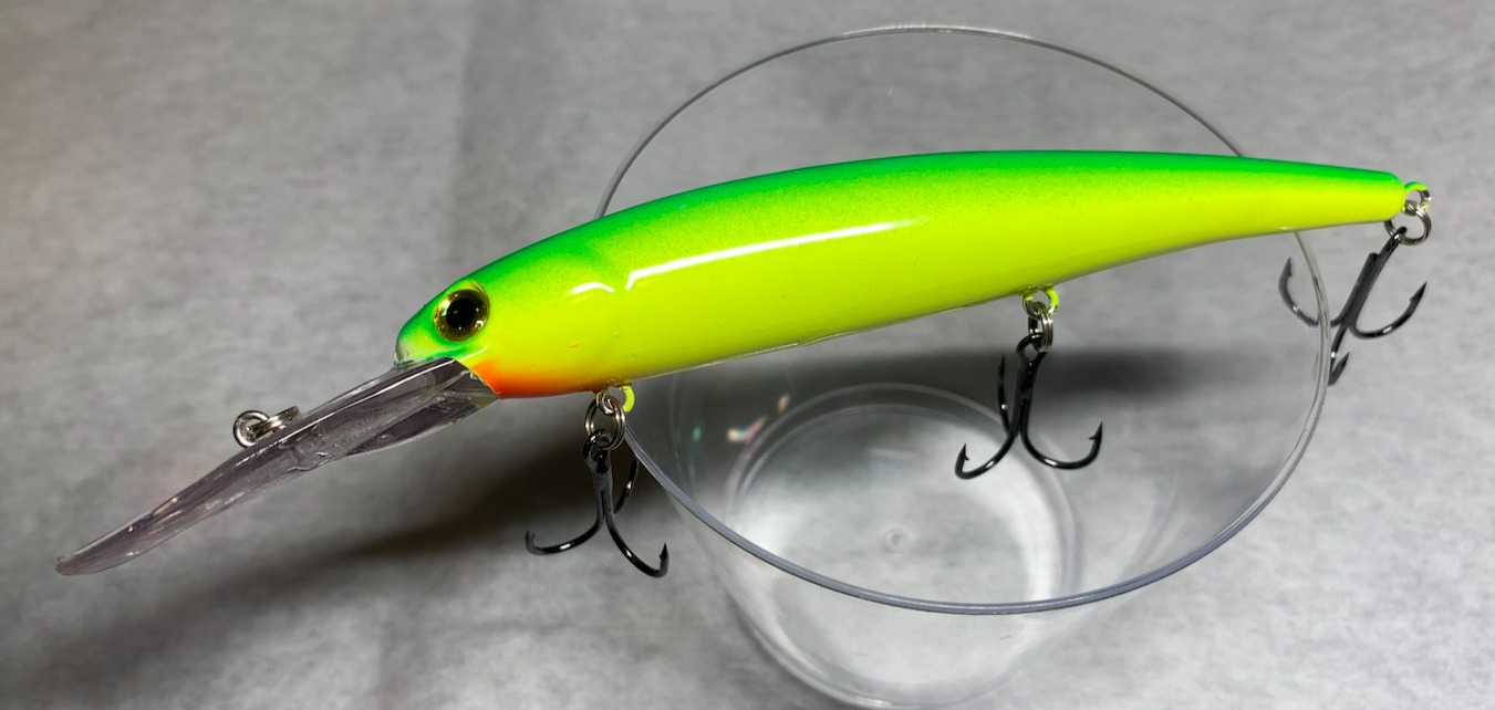 This bait is mostly chartreuse, with lime accents on the back, with a hint of red under the chin.