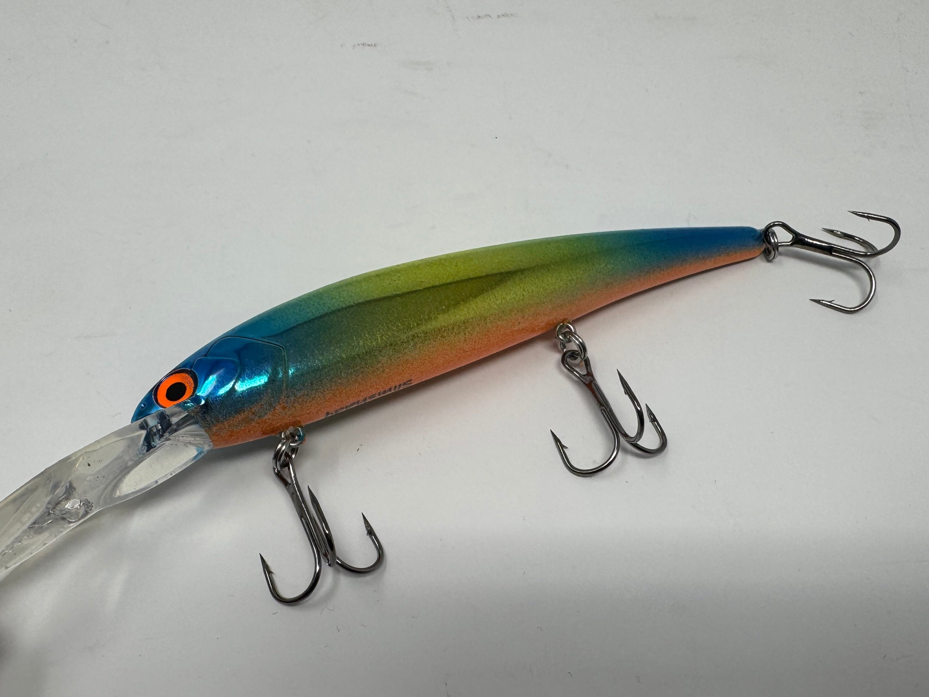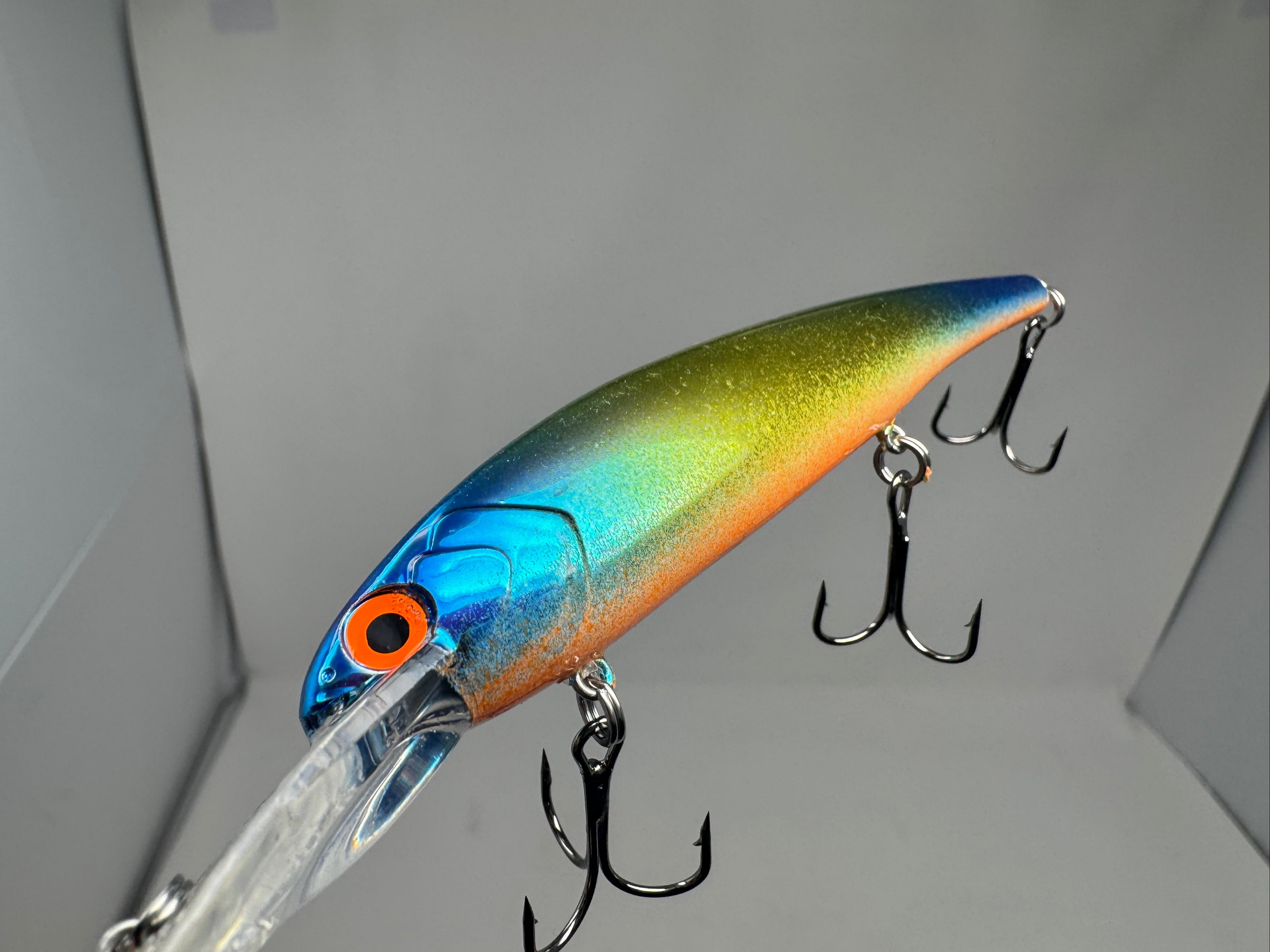 Back my popular demand! This bait has translucent blue and gold over a chrome blank, with a hot orange belly and eyes. I had actually discontinued making this bait, but I had to bring it back due to the success Captain Juls was having with it over the summer.